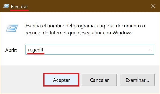 En la ventana que se abrirá, escribe el comando regedit y haz clic en Aceptar.