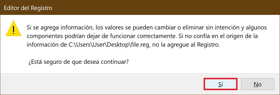 Una vez que el archivo se haya guardado, puedes agregar su contenido al registro. Haz doble clic sobre él con el botón izquierdo del mouse y confirma tu intención de realizar cambios en el registro presionando el botón Sí.