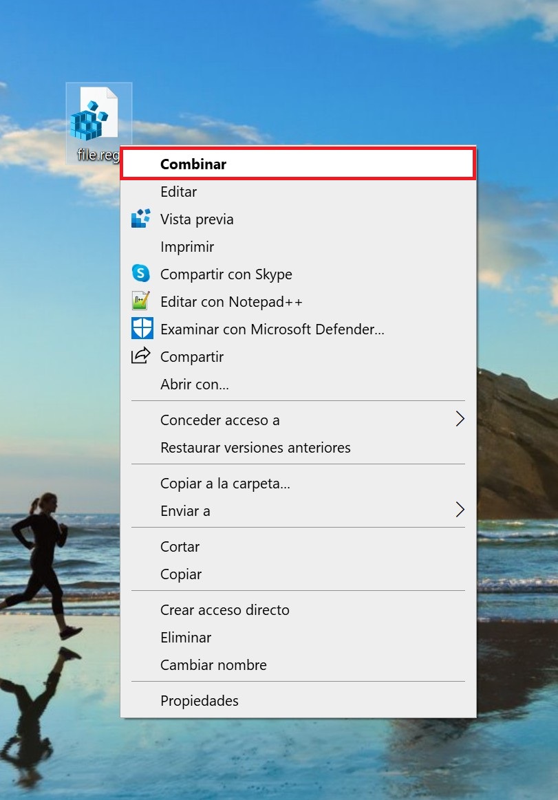 Otra opción es hacer clic con el botón derecho del mouse sobre el archivo .reg y, en el menú contextual que aparece, seleccionar la opción Combinar.