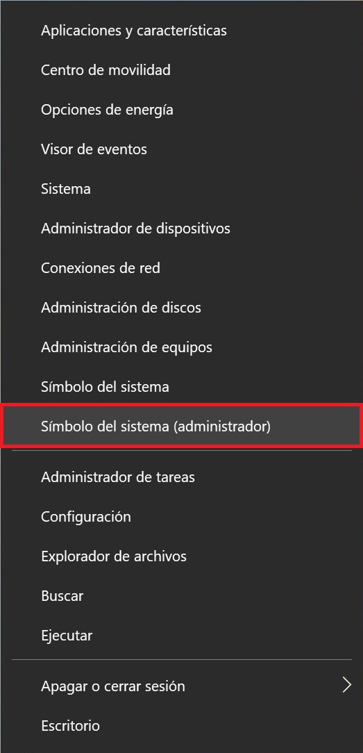 Un cuarto método consiste en lo siguiente: presiona las teclas Win + X y, en el menú contextual que aparece, selecciona Símbolo del sistema (administrador).