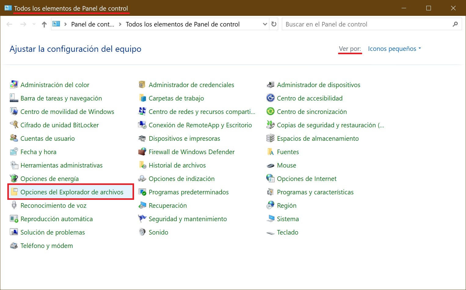 Lo primero que debes hacer es habilitar la visualización de las extensiones de los archivos, ya que, por defecto, el sistema operativo Windows no las muestra. Para hacerlo, abre el Panel de control, selecciona en el menú desplegable Ver por: Iconos pequeños y luego elige la opción Opciones del Explorador de archivos.