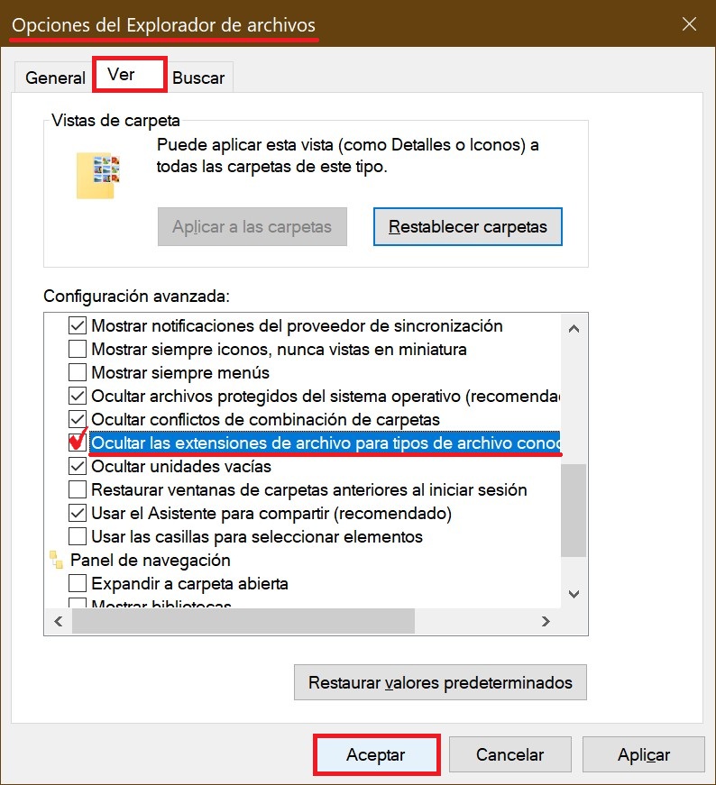 En la ventana Opciones del Explorador de archivos que se abrirá, ve a la pestaña Ver y desmarca la casilla Ocultar las extensiones de los tipos de archivo conocidos, luego haz clic en Aceptar.