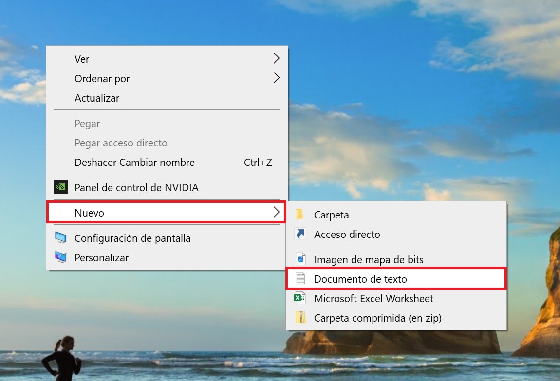 Ahora puedes proceder a crear directamente el archivo .reg. Para hacerlo, haz clic con el botón derecho del ratón en cualquier parte libre del escritorio y, en el menú contextual que aparece, selecciona Nuevo → Documento de texto.